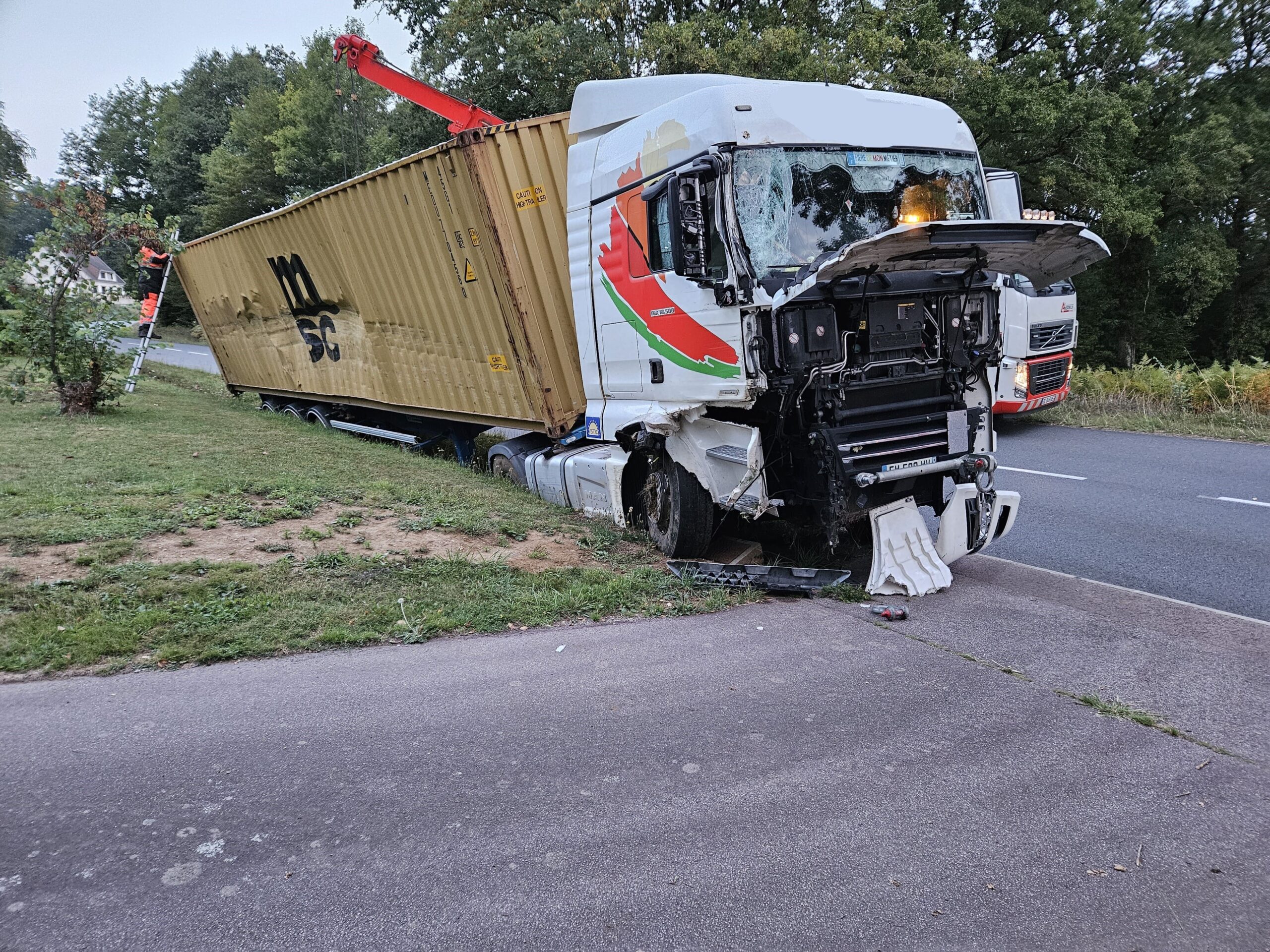 Benne entièrement chargée de déchets industriels renversée à la sortie d'un rond-point. Mise en sécurité...